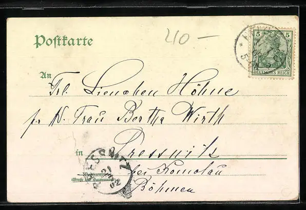 Personenbezogene Daten auf der Rückseite der Karte wurden durch blauen Textmarker unkenntlich gemacht. Die blauen Stellen sind auf die Vorderseite durchgeweicht und wirken sich negativ auf das Postkartenfoto aus