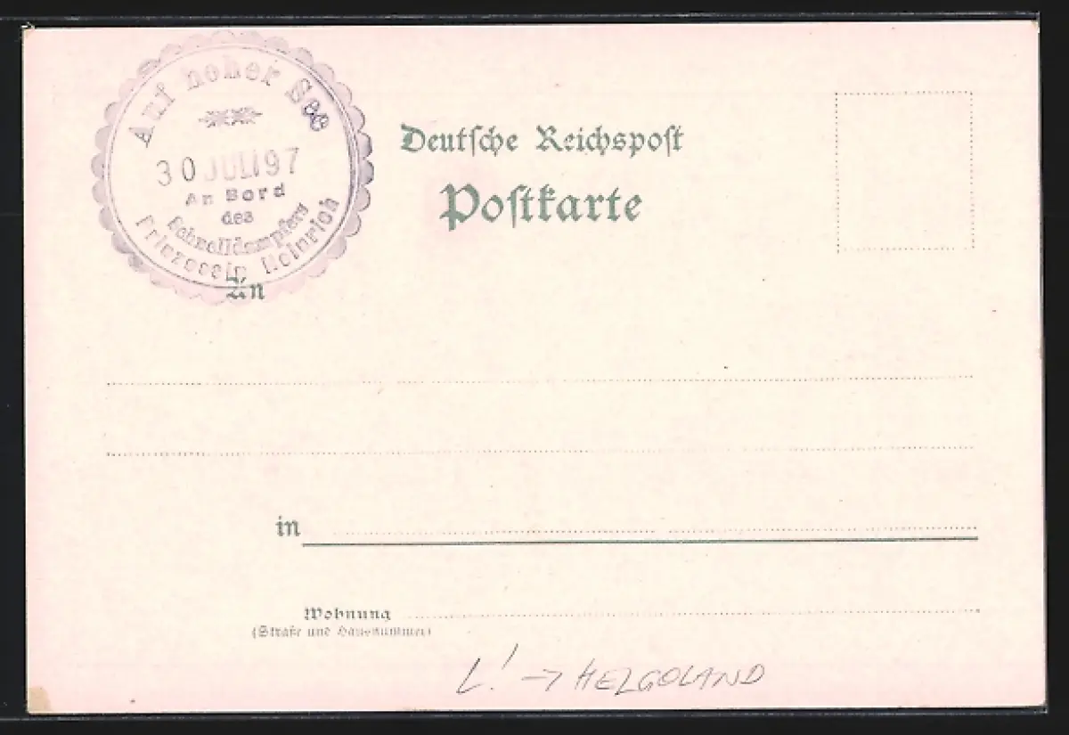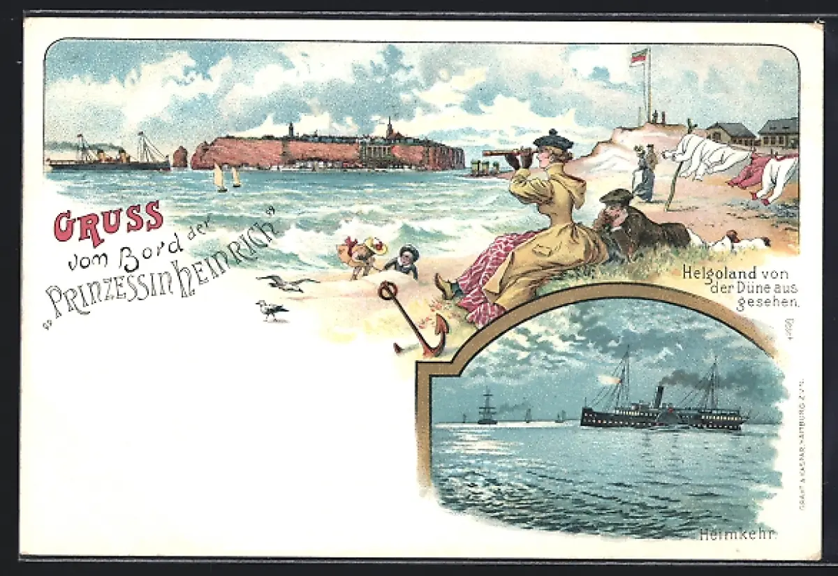 Lithographie Helgoland, Teilansicht von der Düne aus gesehen, Heimkehr des Dampfers Prinzessin Heinrich