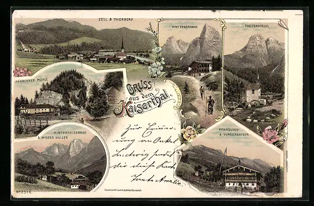 Lithographie Hinterbärenbad, Kaisertal, Sparchner Mühle, Todtenkirchl, Pfandlhof und Vorderkaiser