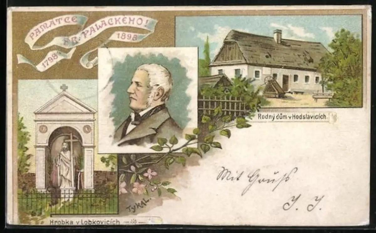 Lithographie Hodslavice, Památce Fr. Palackého 1898, Rodný dum, Hrobka v Lobkovicích