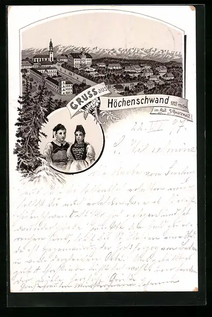 Lithographie Höchenschwand /Bad. Schwarzwald, Ortsansicht aus der Vogelschau, Paar in Tracht
