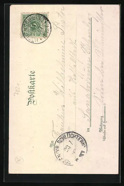 Personenbezogene Daten auf der Rückseite der Karte wurden durch blauen Textmarker unkenntlich gemacht. Die blauen Stellen sind auf die Vorderseite durchgeweicht und wirken sich negativ auf das Postkartenfoto aus