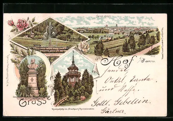 Lithographie Hof i. Bayern, Gesamtansicht, Thomashöhe im Stadtpark