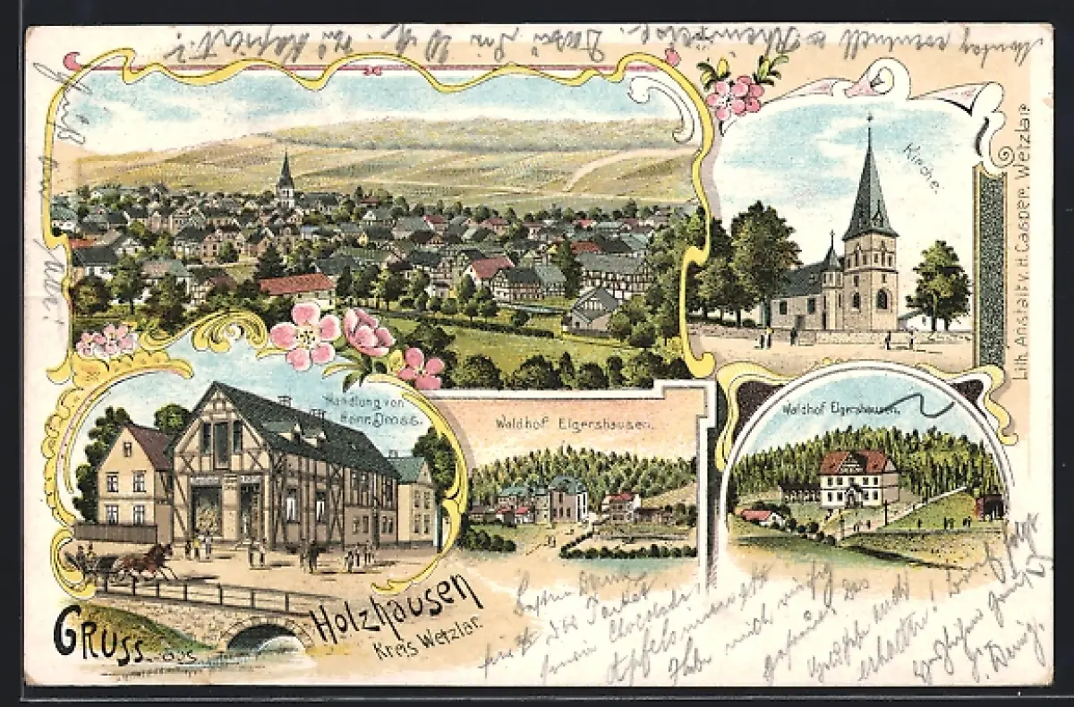Lithographie Holzhausen /Wetzlar, Handlung v. Heinrich Dross, Waldhof Elgershausen, Kirche