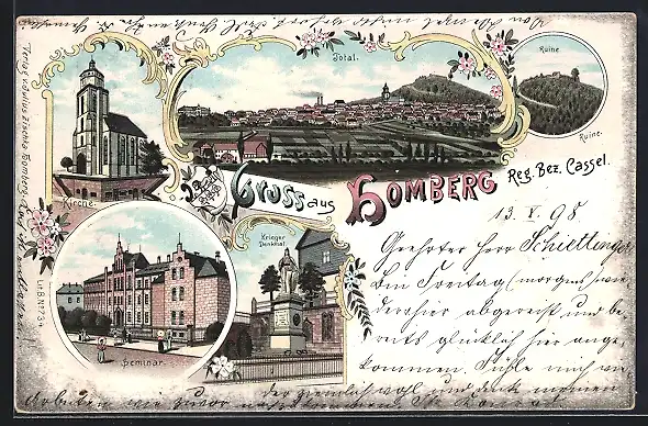 Lithographie Homberg Reg. / Cassel, Kirche, Seminar, Krieger-Denkmal