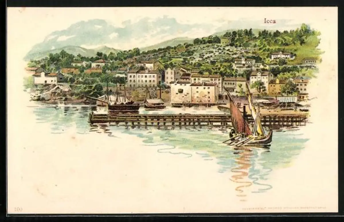 Lithographie Ika, Ortsansicht vom Boothafen gesehen
