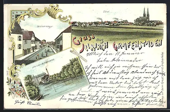 Lithographie Illkirch-Grafenstaden, Grüner Jäger, Illkircher Mühlenwerke, Totalansicht
