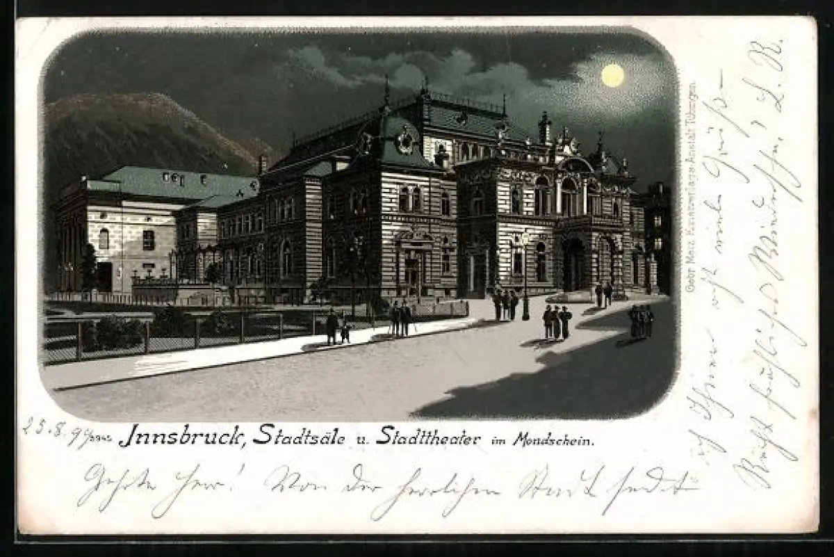 Lithographie Innsbruck, Stadtsäle und Stadttheater im Vollmondlicht