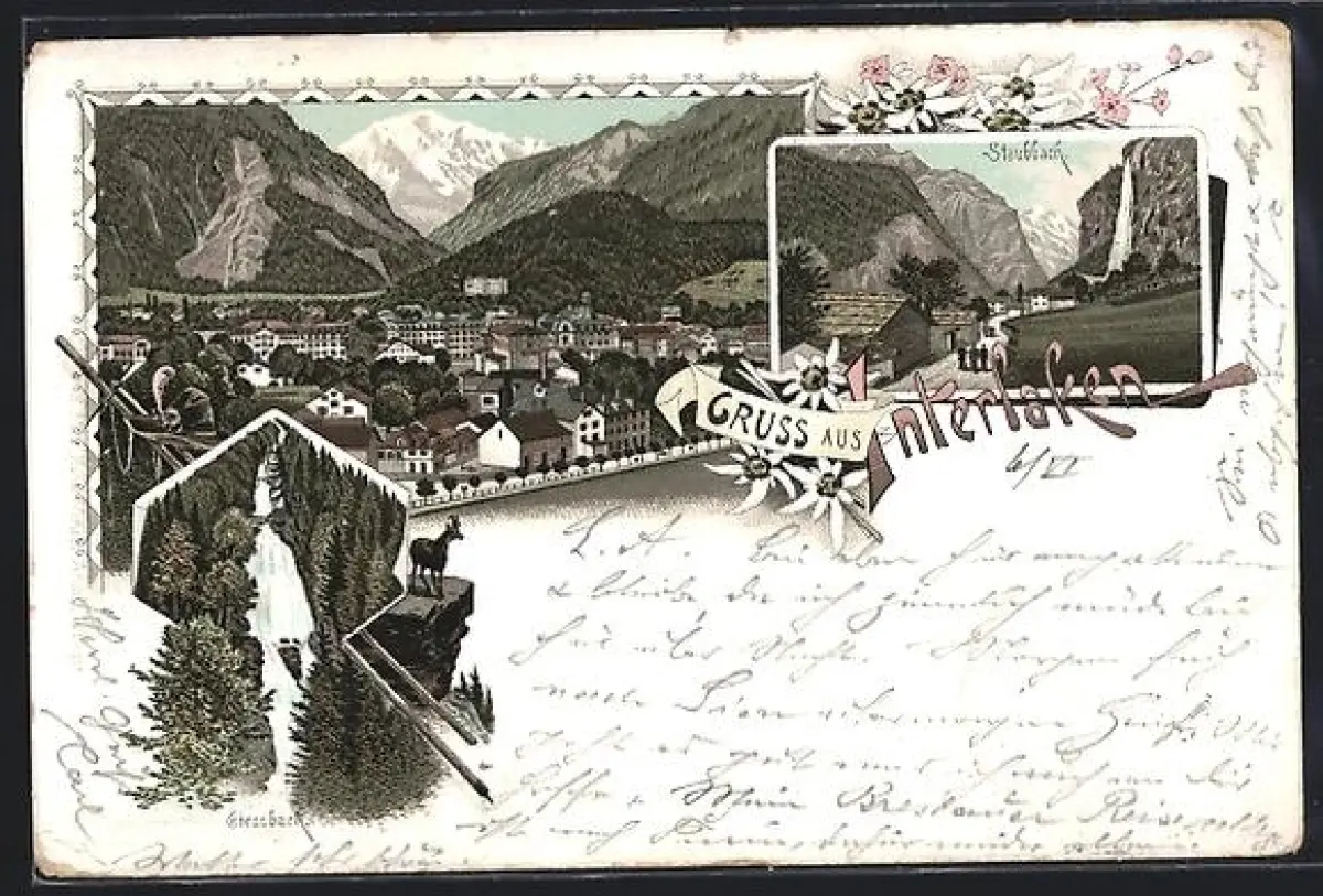 Lithographie Interlaken, Giessbach, Staubbach, Gesamtansicht
