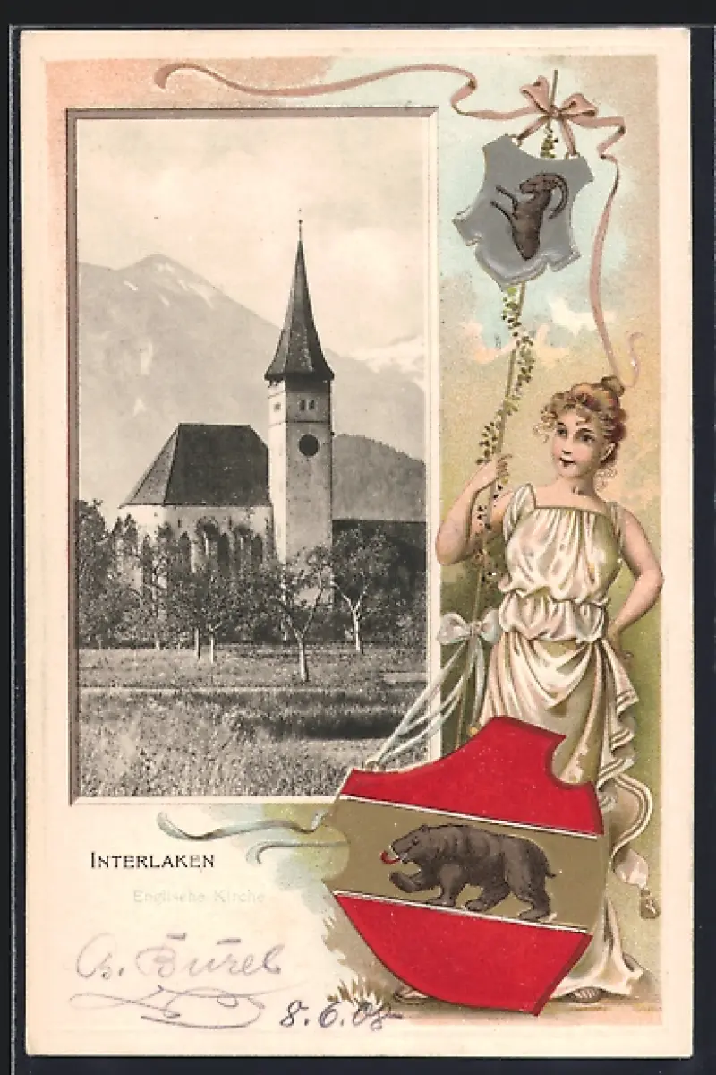 Lithographie Interlaken, Kirche, Frau mit Wappenschild