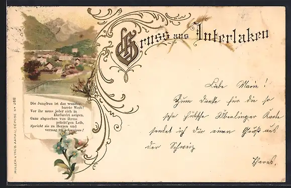 Lithographie Interlaken, Ortsansicht aus der Vogelschau