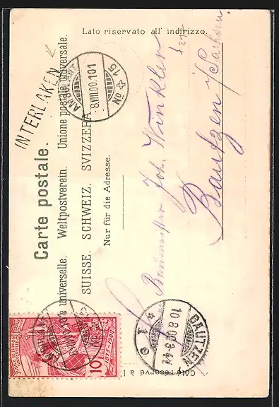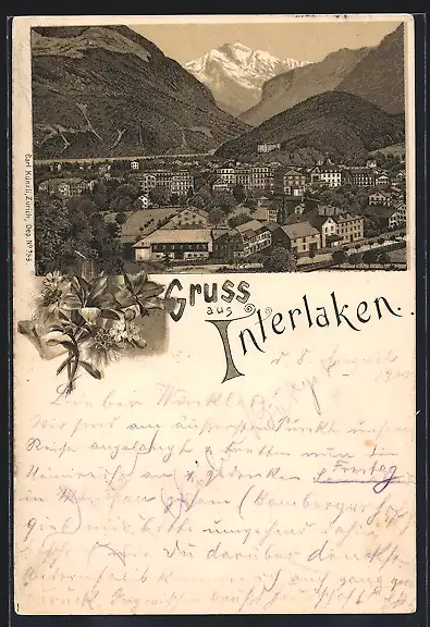Lithographie Interlaken, Teilansicht gegen die Jungfrau