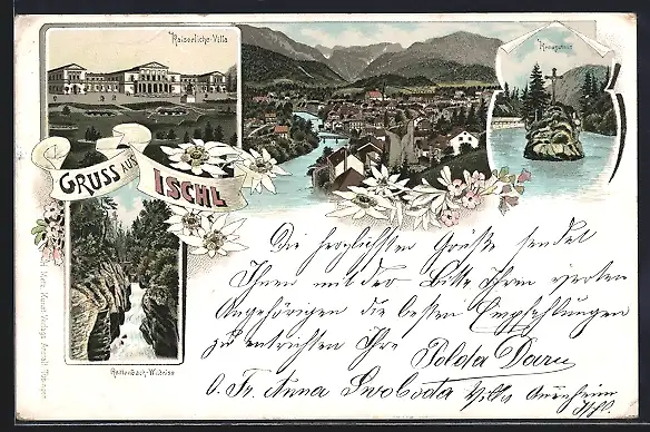Lithographie Ischl, Kreuzstein, Kaiserliche Villa, Rettenbach-Wildniss