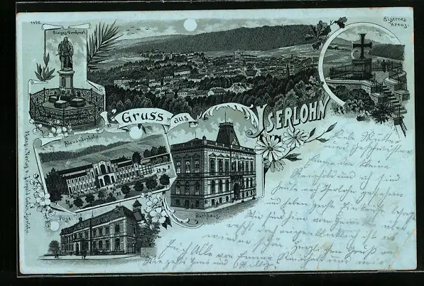 Lithographie Iserlohn, Alexanderhöhe, Post, Siedesdenkmal, Rathaus