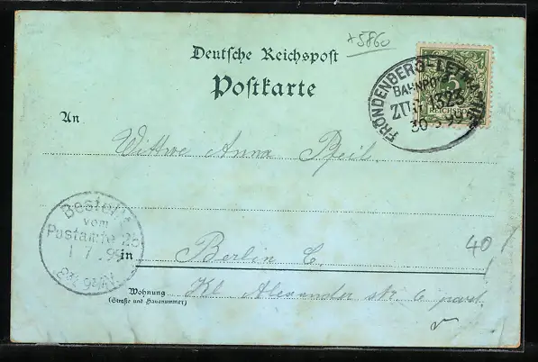 Personenbezogene Daten auf der Rückseite der Karte wurden durch blauen Textmarker unkenntlich gemacht. Die blauen Stellen sind auf die Vorderseite durchgeweicht und wirken sich negativ auf das Postkartenfoto aus