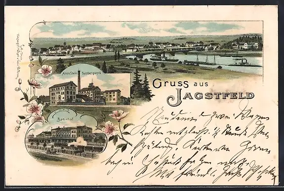 Lithographie Jagstfeld, Altes Stein-Salzbergwerk, Bahnhof, Totalansicht