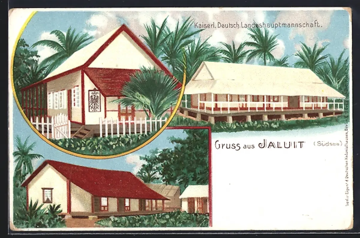 Lithographie Jaluit, Gebäudeansichten der Kaiserl. Deutsch. Landeshauptmannschaft mit Palmen
