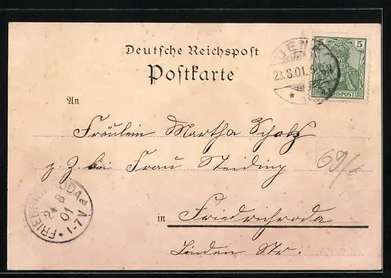 Personenbezogene Daten auf der Rückseite der Karte wurden durch blauen Textmarker unkenntlich gemacht. Die blauen Stellen sind auf die Vorderseite durchgeweicht und wirken sich negativ auf das Postkartenfoto aus