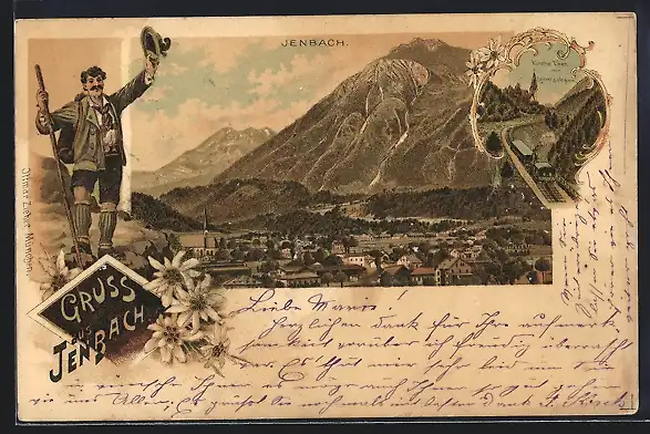 Lithographie Jenbach, Kirche Eben mit Zahnradbahn, Panorama