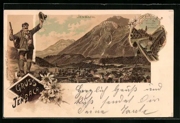 Lithographie Jenbach, Ortsansicht, Kirche Eben mit Zahnradbahn