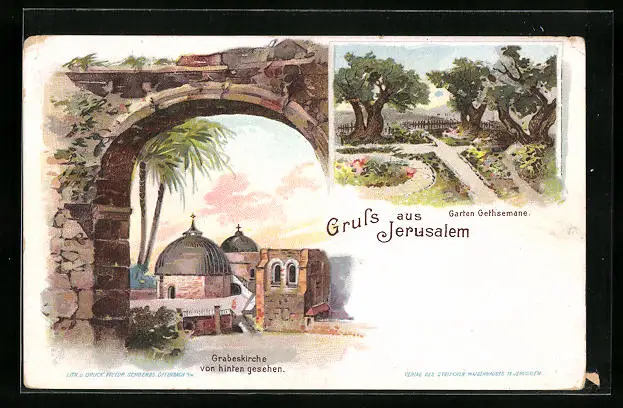 Lithographie Jerusalem, Grabeskirche von hinten gesehen, Garten Gethsemane