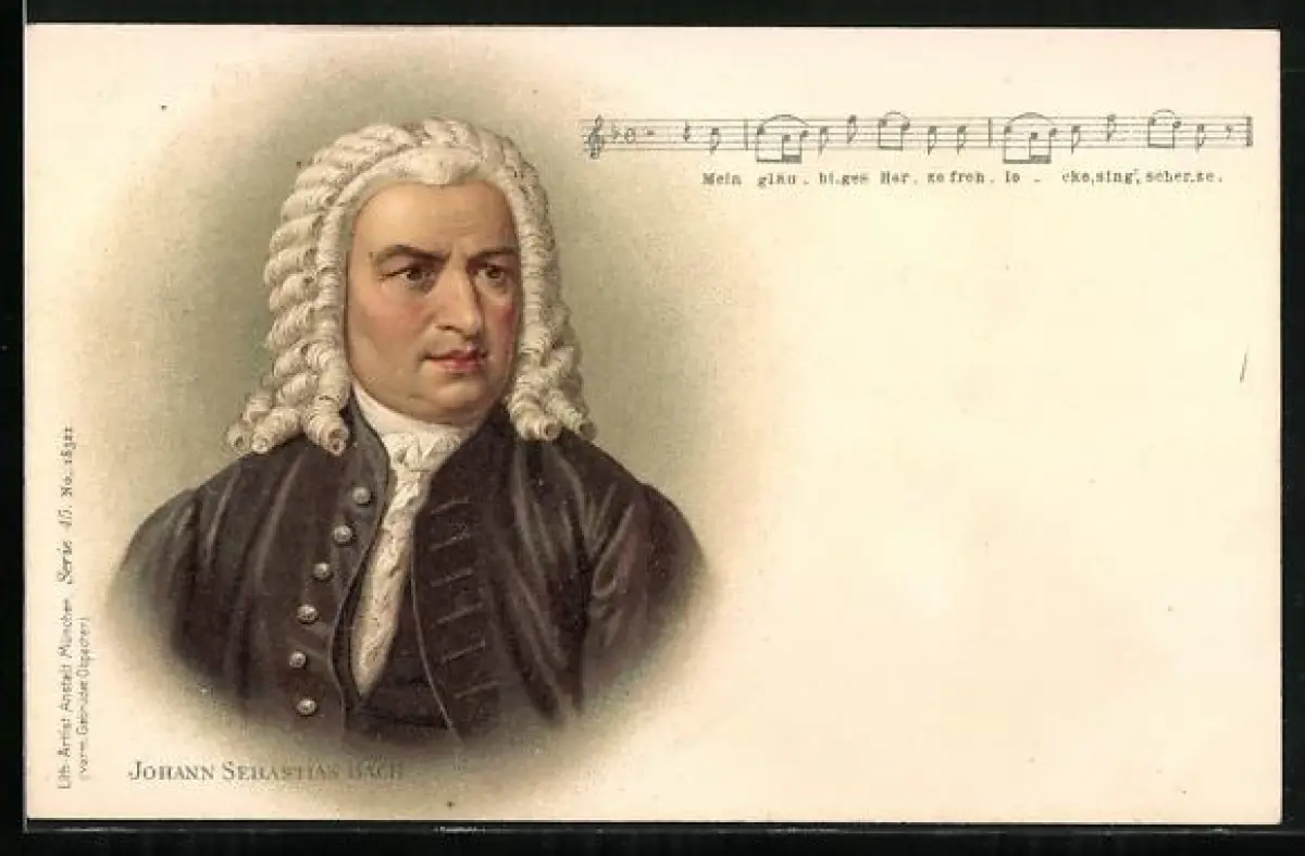 Lithographie Johann Sebastian Bach, Portrait des Komponisten und Noten