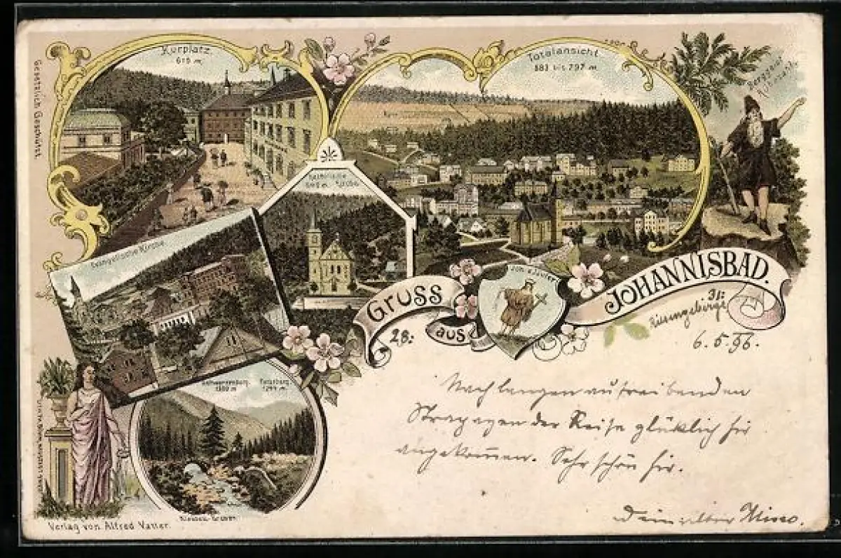 Lithographie Johannisbad, Kurplatz, Totalansicht, Ev. Kirche