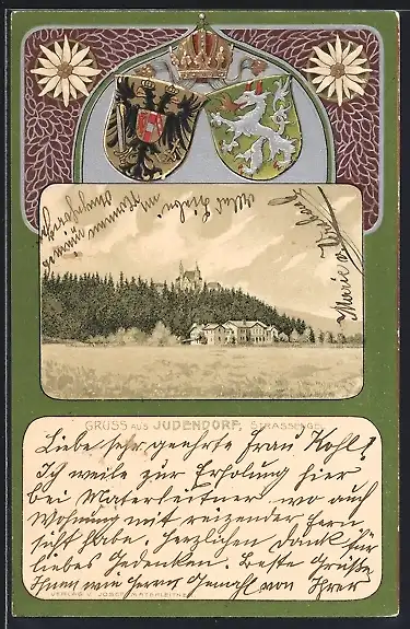 Lithographie Judendorf-Strassengel, Hofgebäude und Schloss, Passepartout mit Wappen