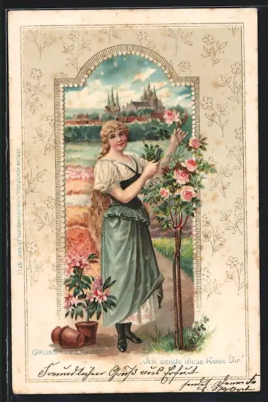 Lithographie Jugendstil, junge Frau mit einem Rosengruss, Stadtpanorama