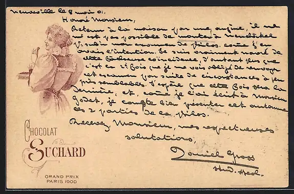 Lithographie Junge Frau nascht heimlich von der Chocolat Suchard