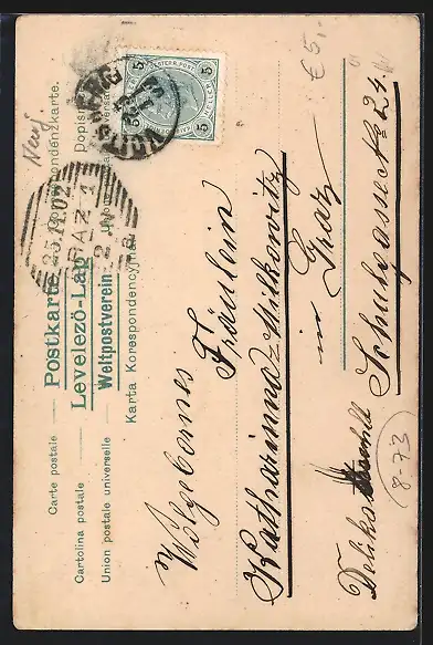 Personenbezogene Daten auf der Rückseite der Karte wurden durch blauen Textmarker unkenntlich gemacht. Die blauen Stellen sind auf die Vorderseite durchgeweicht und wirken sich negativ auf das Postkartenfoto aus