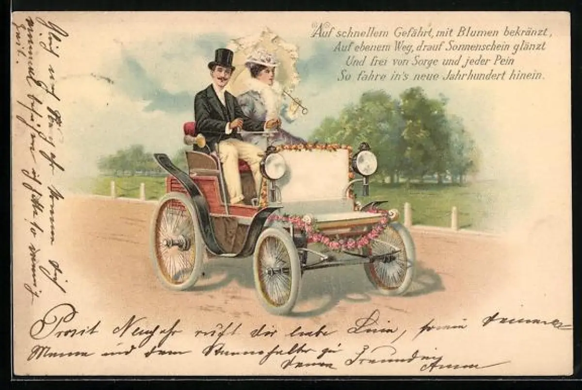 Lithographie Junges Paar in geschmücktem Auto, Gedicht