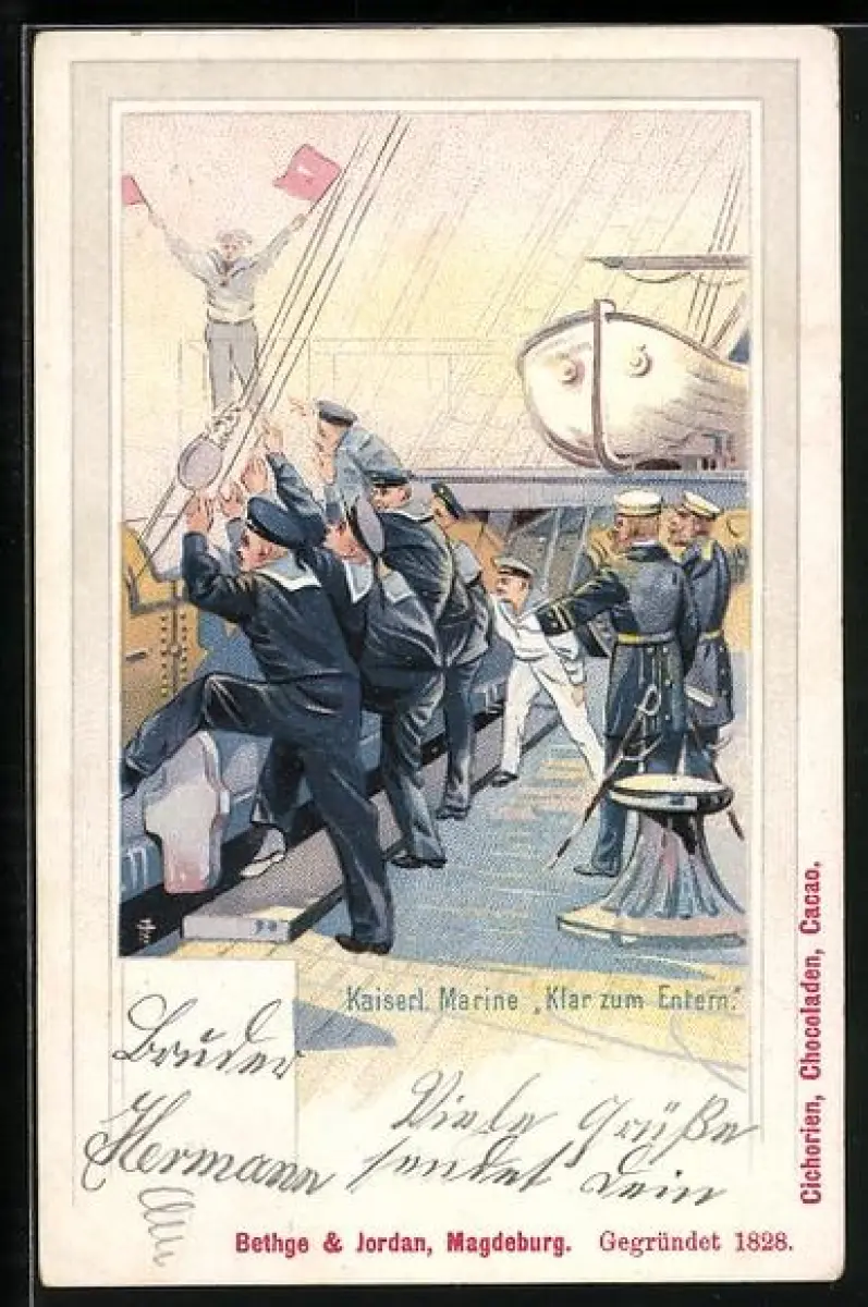 Lithographie Kaiserl. Marine, Klar zum Entern, Matrose gibt seinen Kameraden Signal zum Entern