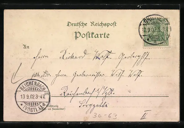Personenbezogene Daten auf der Rückseite der Karte wurden durch blauen Textmarker unkenntlich gemacht. Die blauen Stellen sind auf die Vorderseite durchgeweicht und wirken sich negativ auf das Postkartenfoto aus