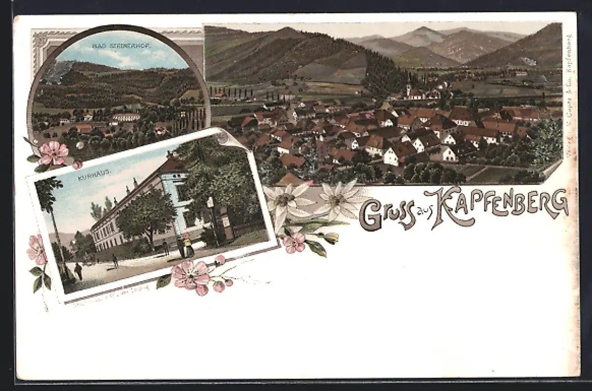 Lithographie Kapfenberg, Bad Steinerhof, Kurhaus und Gesamtansicht