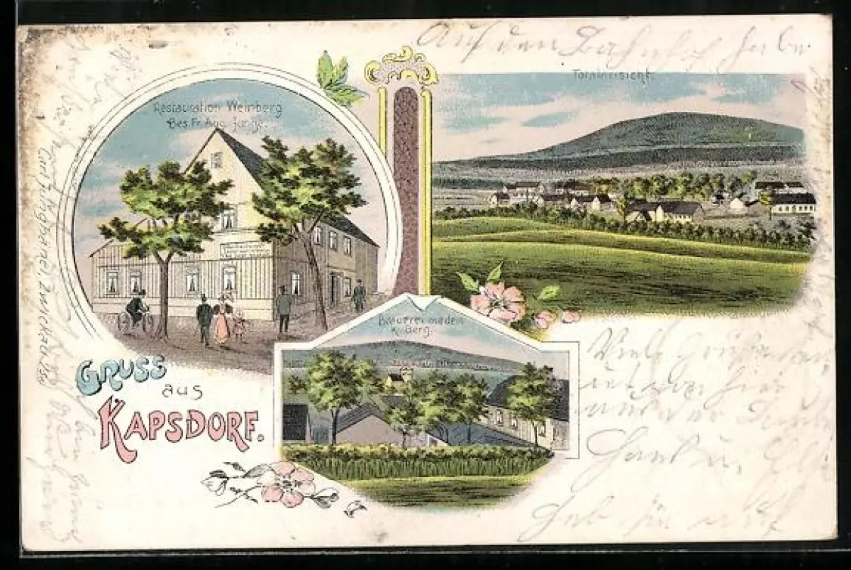 Lithographie Kapsdorf, Restaurant Weinberg, Bes. Fr. Aug. Junge, Brauerei mit dem Kl. Berg