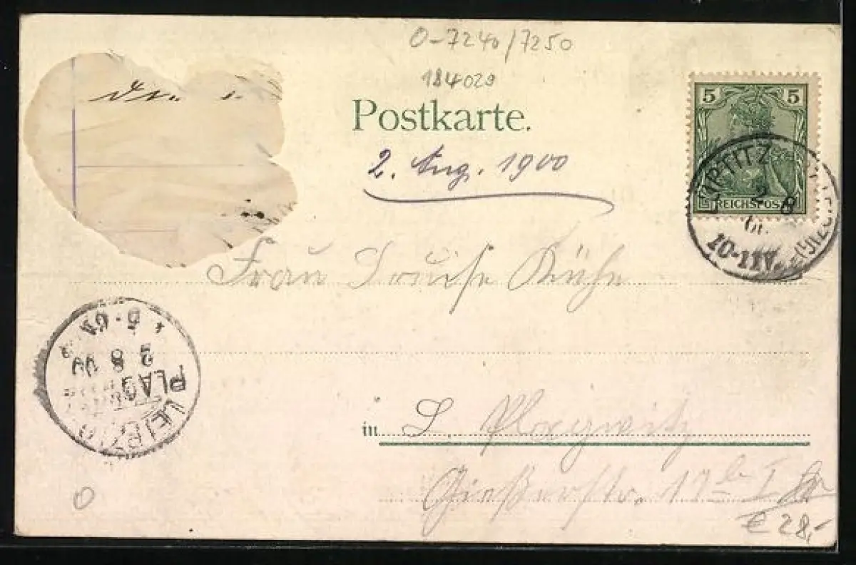 gelaufen 1900, rückseitig Klebe- und Papierreste, guter Zustand
