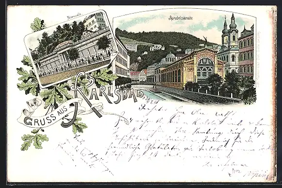 Lithographie Karlsbad, Blick auf Felsenquelle und Sprudelcolonade