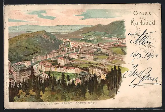 Lithographie Karlsbad, Blick von Franz Josefs Höhe
