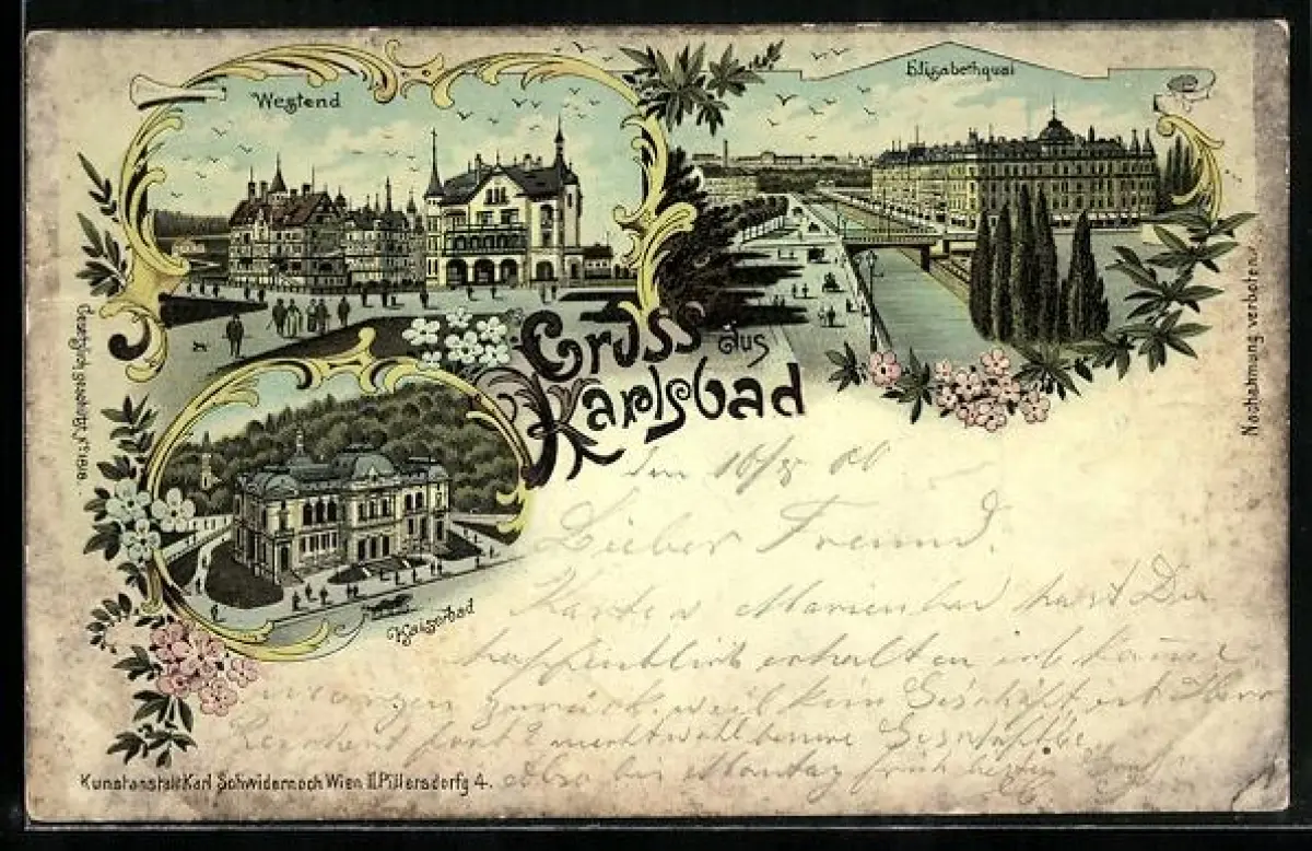 Lithographie Karlsbad, Elisabethquai aus der Vogelschau, Westend und Kaiserbad