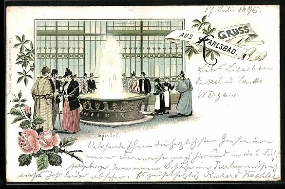 Lithographie Karlsbad, Sprudel mit Kurgästen