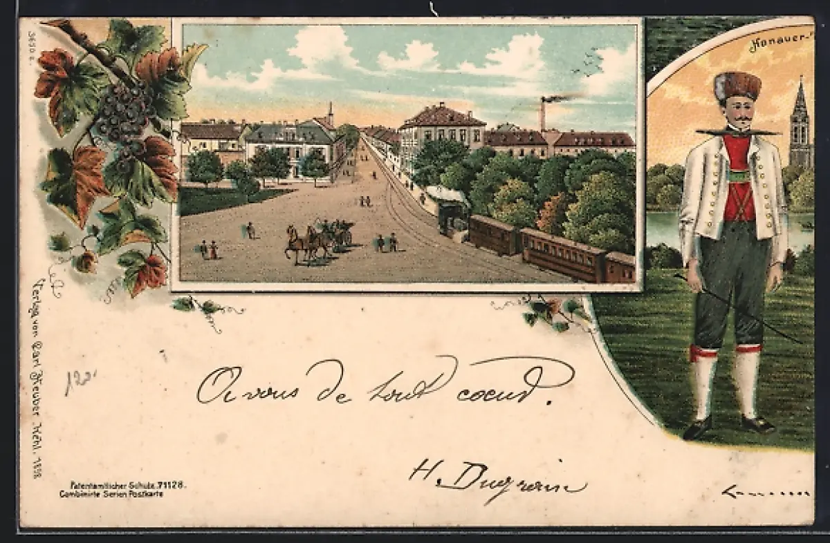Lithographie Kehl, Strassenpartie im Ort, Mann in Tracht