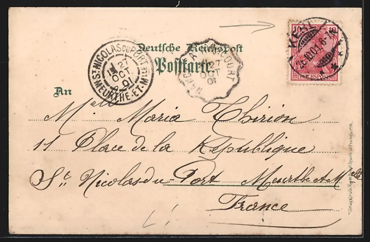 Personenbezogene Daten auf der Rückseite der Karte wurden durch blauen Textmarker unkenntlich gemacht. Die blauen Stellen sind auf die Vorderseite durchgeweicht und wirken sich negativ auf das Postkartenfoto aus