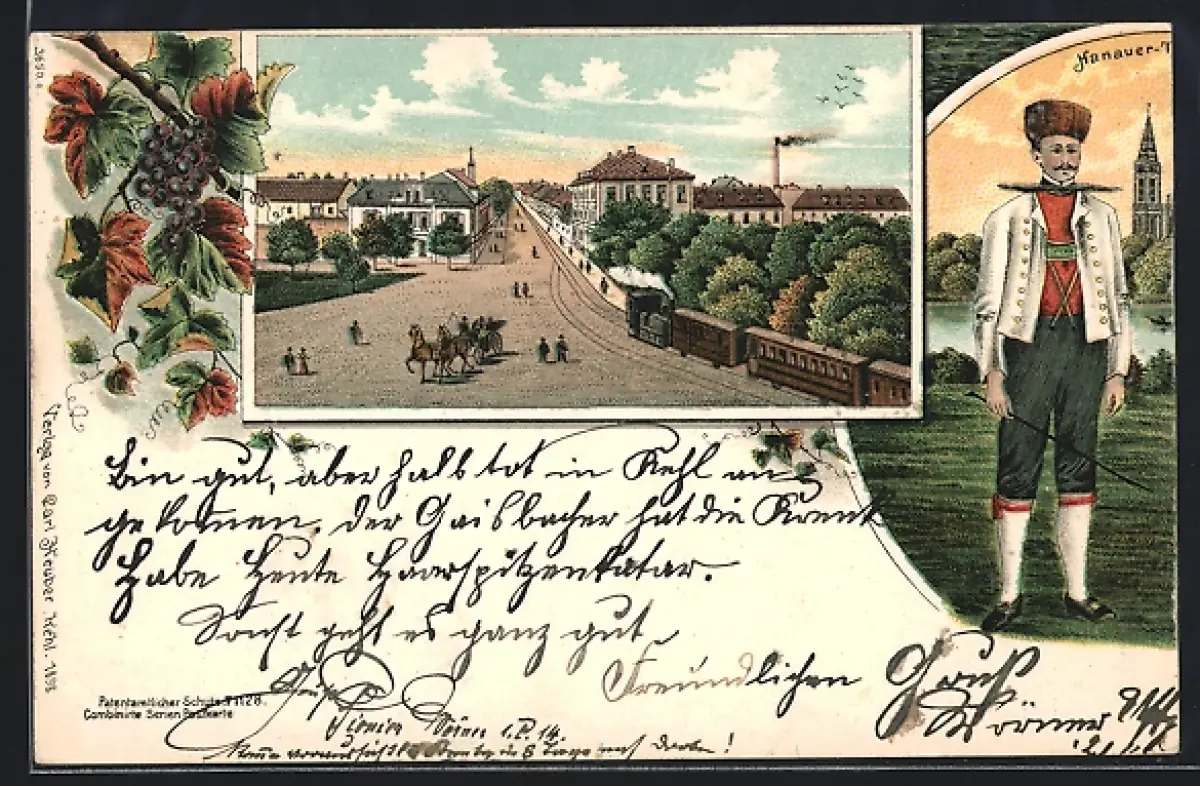 Lithographie Kehl, Strassenpartie mit Zug, Mann in Tracht