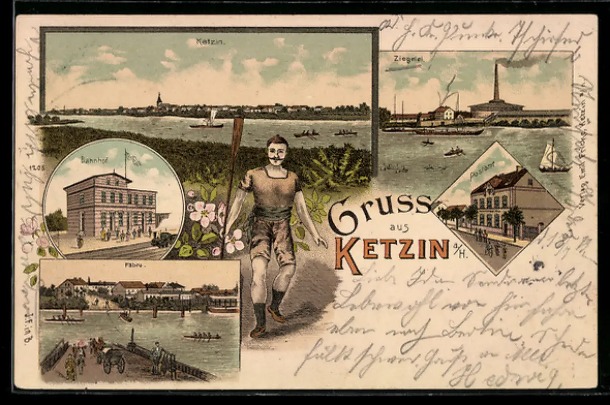 Lithographie Ketzin a. H., Bahnhof, Postamt, Fähre, Ruderer