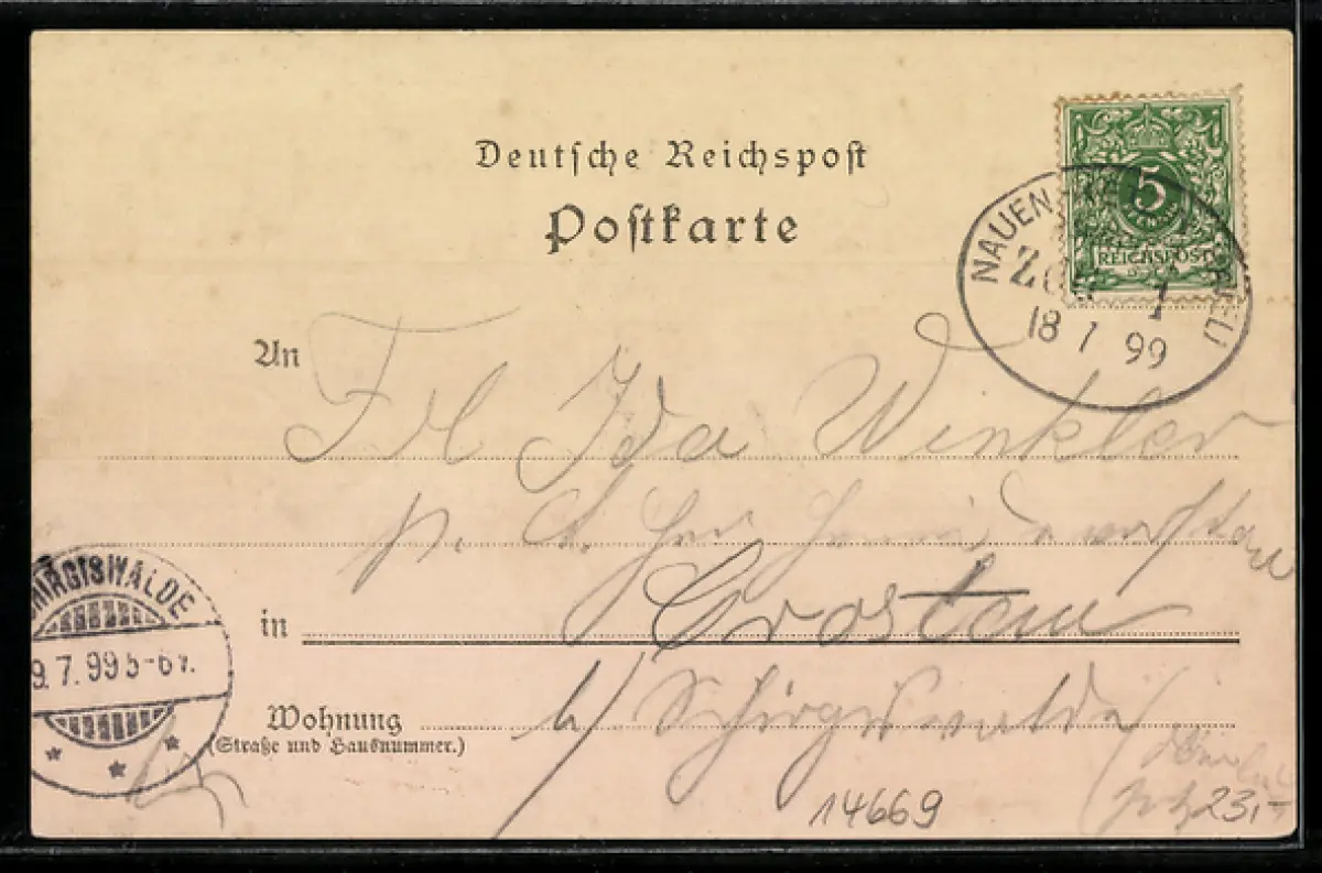 gelaufen 1899, Eckknick rechts oben, guter Zustand