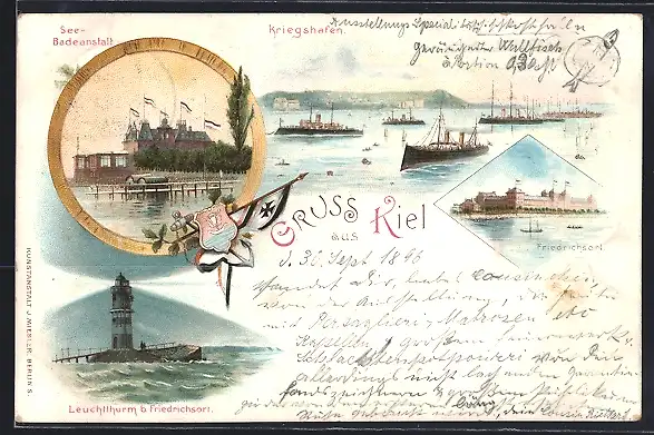 Lithographie Kiel, Kriegshafen, See-Badeanstalt, Leuchtturm