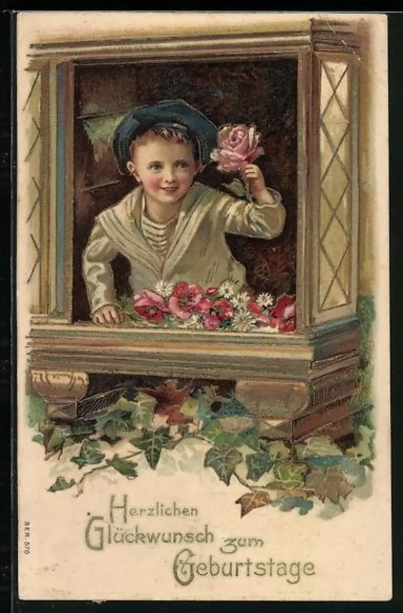 Lithographie Kind in Matrosenuniform mit einer Rose, Herzlichen Glückwunsch zum Geburtstag
