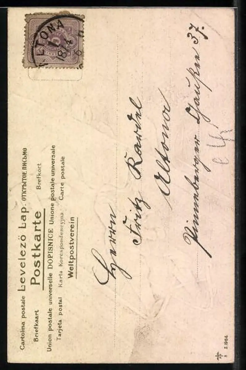 Personenbezogene Daten auf der Rückseite der Karte wurden durch blauen Textmarker unkenntlich gemacht. Die blauen Stellen sind auf die Vorderseite durchgeweicht und wirken sich negativ auf das Postkartenfoto aus