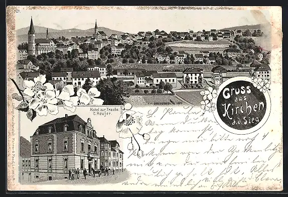 Lithographie Kirchen a. d. Sieg, Hotel zur Traube von C. Heufer, Ortsansicht